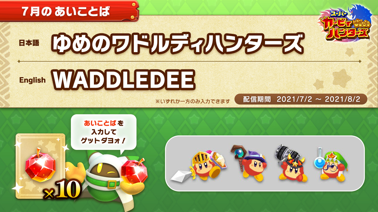 Twitter 上的 星のカービィ こんにちは レポーターのワドルディです なんと 今月から みんなで カービィハンターズz のあいことばを配信しちゃいます これを入力すれば もれなく ジェムリンゴ5コをプレゼント 詳しい情報は 以下のページをチェック